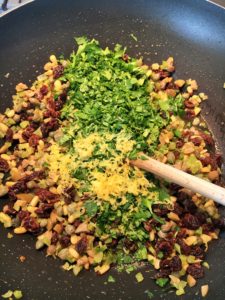 - Mettre 75 ml d’huile d’olive à chauffer dans une sauteuse et faire revenir à feu vif ; les dés de céleri et les pignons pendant 4 à 5 minutes en remuant de temps en temps. Stopper la cuisson lorsque les pignons commencent à dorer. Hors du feu ajouter les câpres et leur jus, les dés d’olives vertes, le safran et son eau. Égoutter les raisins et les ajouter avec le persil haché, les zestes et le jus de citron. Saler et réserver.