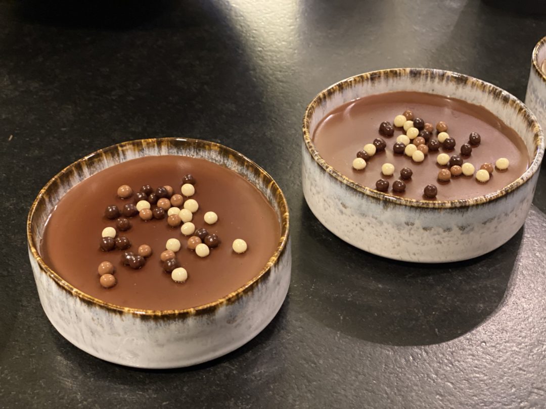 - Mettre les ingrédients dans une casserole. Faire chauffer sans cesser de remuer à l’aide d’un fouet jusqu’à ébullition. Verser dans des ramequins et laisser refroidir.