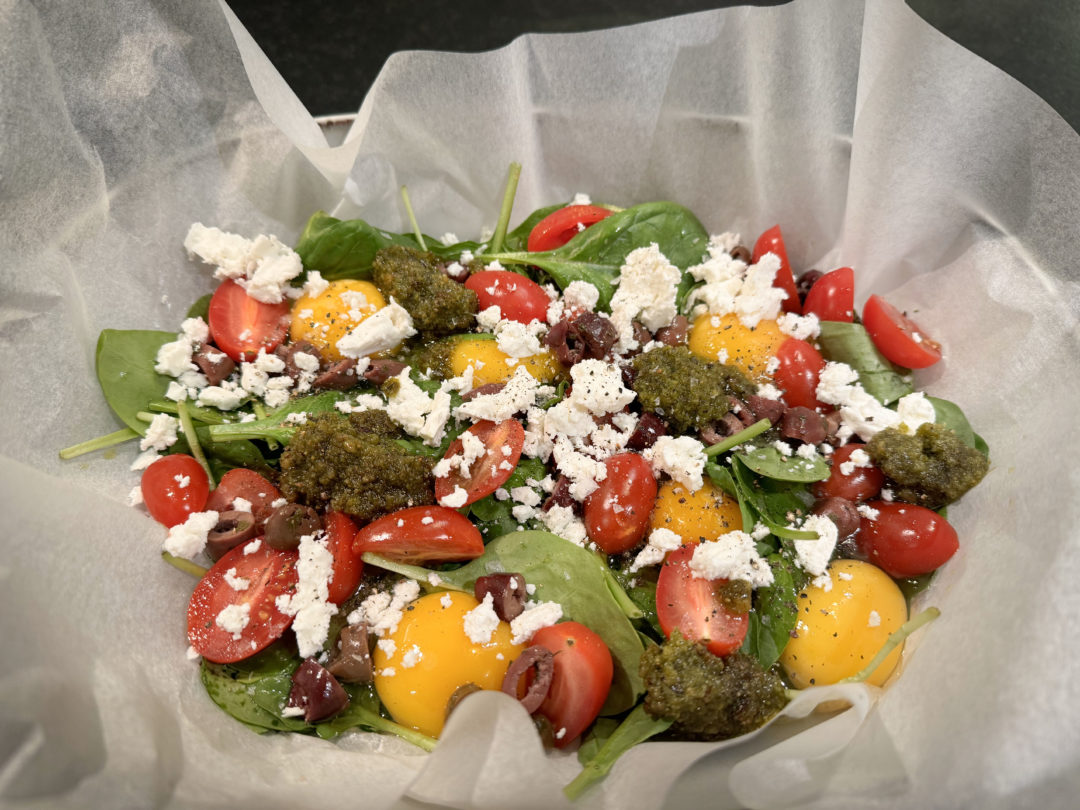 3. Mettre une bonne poignée de feuilles d’épinards dans le fond, les tomates cerises coupées en 2, les olives noires coupées en morceaux.