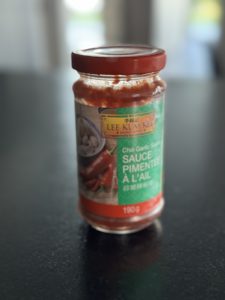 - De l’huile pimentée ( mélanger 2 cuillères à café de sauce pimentée à l’ail, voir photo ci-dessous dans un peu d’huile et le tour et joué!)